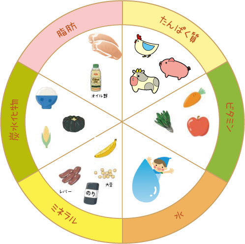 「タンパク質」「脂肪」「炭水化物」「ビタミン」「ミネラル」です。