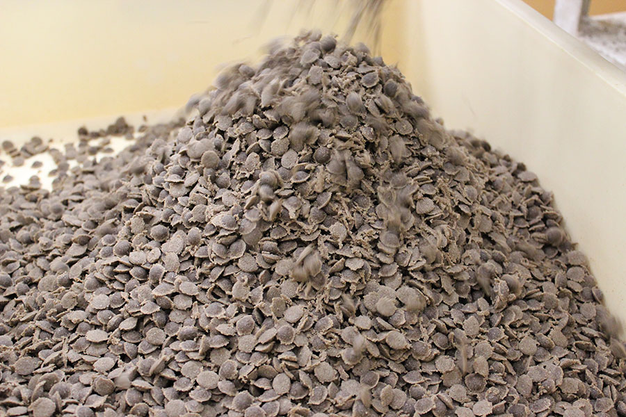 粉末状になったものを、焼成原料を加熱し、形を整える装置され、ワンちゃんが食べやすいドッグフードの形にします。